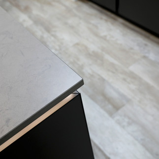 It features the stunning Organic Glass (yes, real glass!) door finish from Pronorm in two subtly distinct colours with a beautiful slim solid Quartz Worktop perfectly complimenting and drawing together the kitchen colour palette.